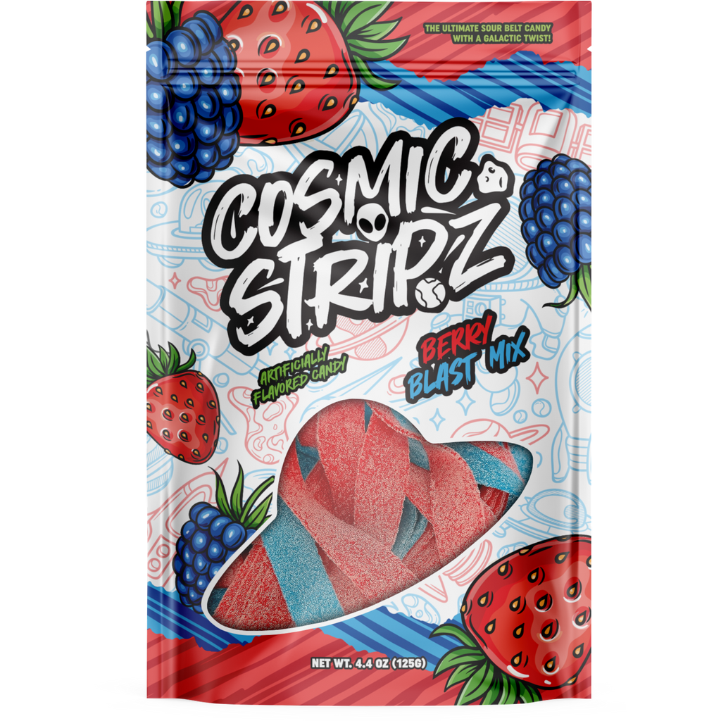 Cosmic Stripz Berry Blast. A delicious mix of super sour strawberry and blue raspberry belts. The ultimate sour belt candy with a galactic twist!