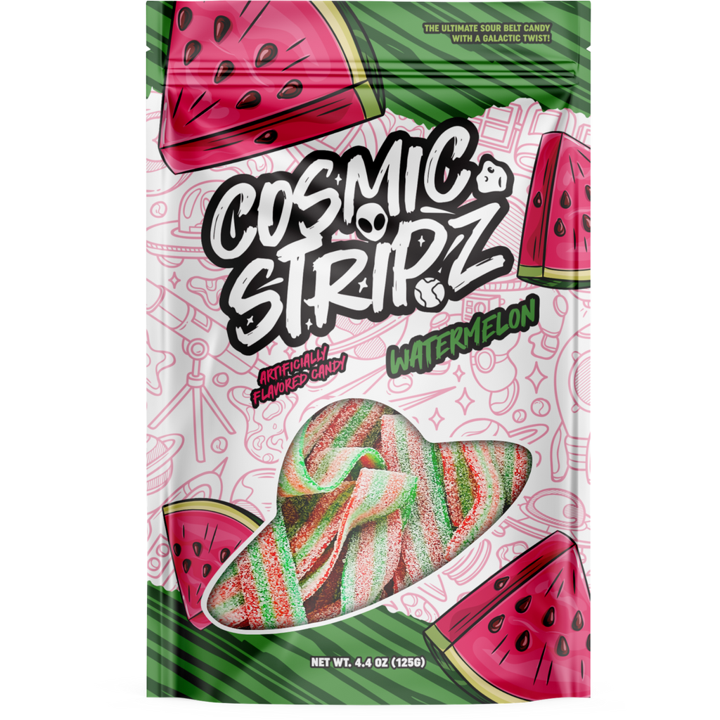 Cosmic Stripz Watermelon. A delicious bag of super sour watermelon belts. The ultimate sour belt candy with a galactic twist!