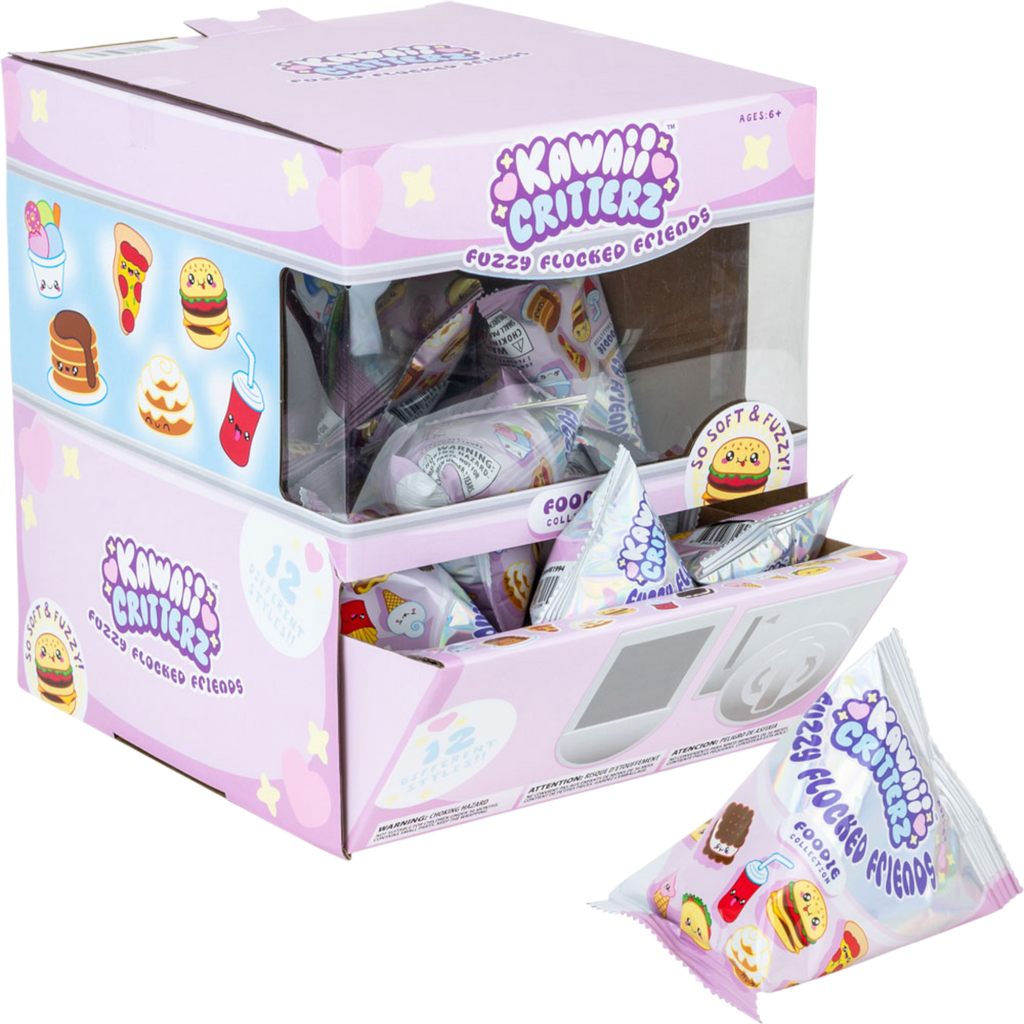 Kawaii Critterz Foodie Collection blind bag. Unwrap an adorable surprise with these Kawaii Critterz blind bags, featuring fuzzy flocked foodie figures. Which one will you get? It's a surprise! 12 different styles to collect. Comes in a retail friendly gravity box