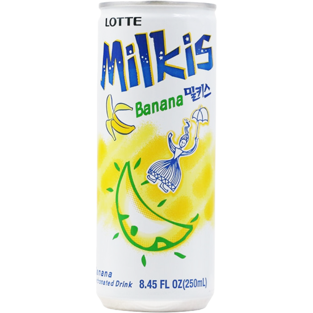 Lotte Milkis Banana. Milkis is a soft drink with sweet and creamy taste of banana added to sweet and soft milk. Absolutely delicious! Product of South Korea.