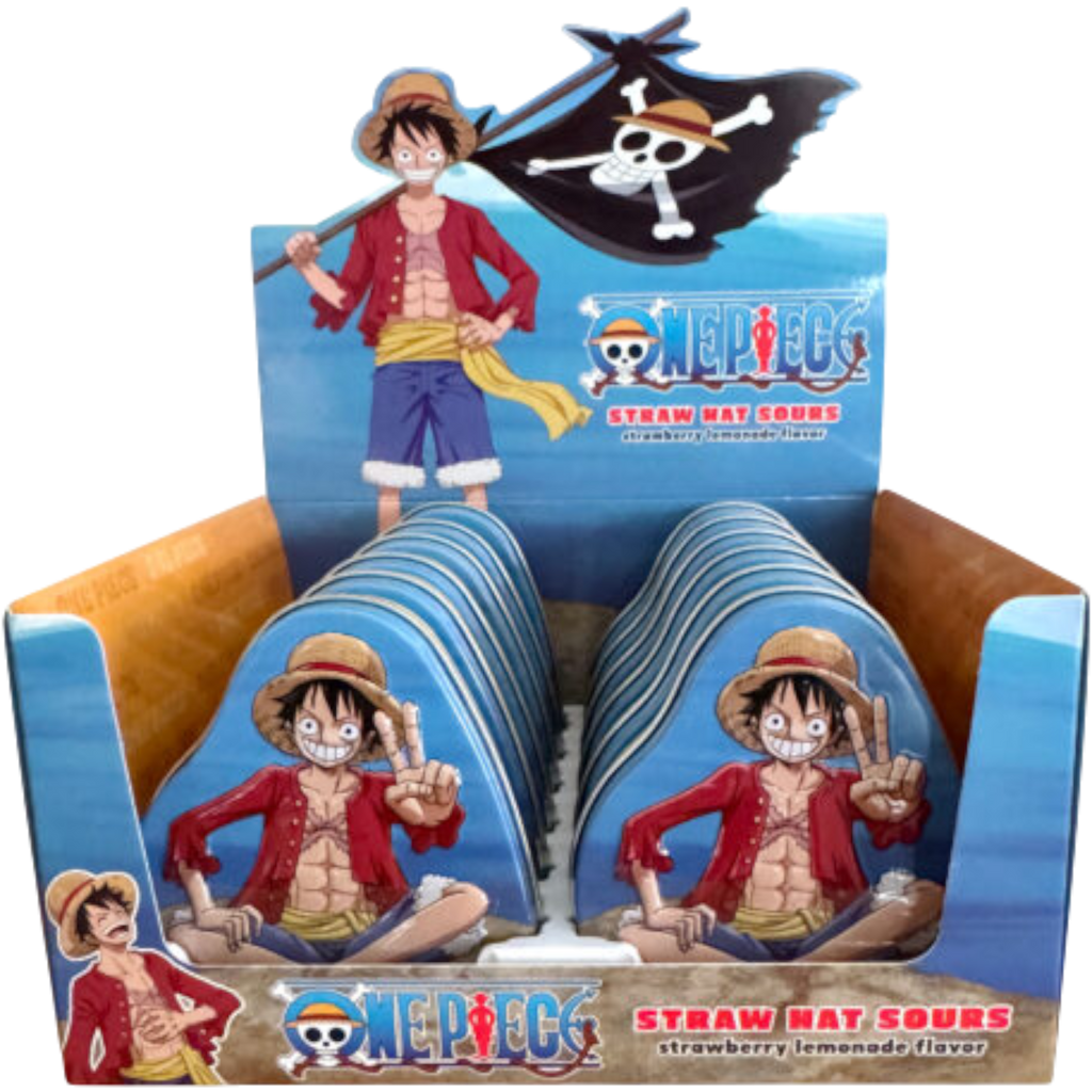 One Piece Strawberry Hat Sours. Set sail with the Straw Hat Pirates! Each Monkey D. Luffy tin contains 1.2 oz of strawberry-lemonade Straw Hat–shaped candies. Packed 12 tins per display.