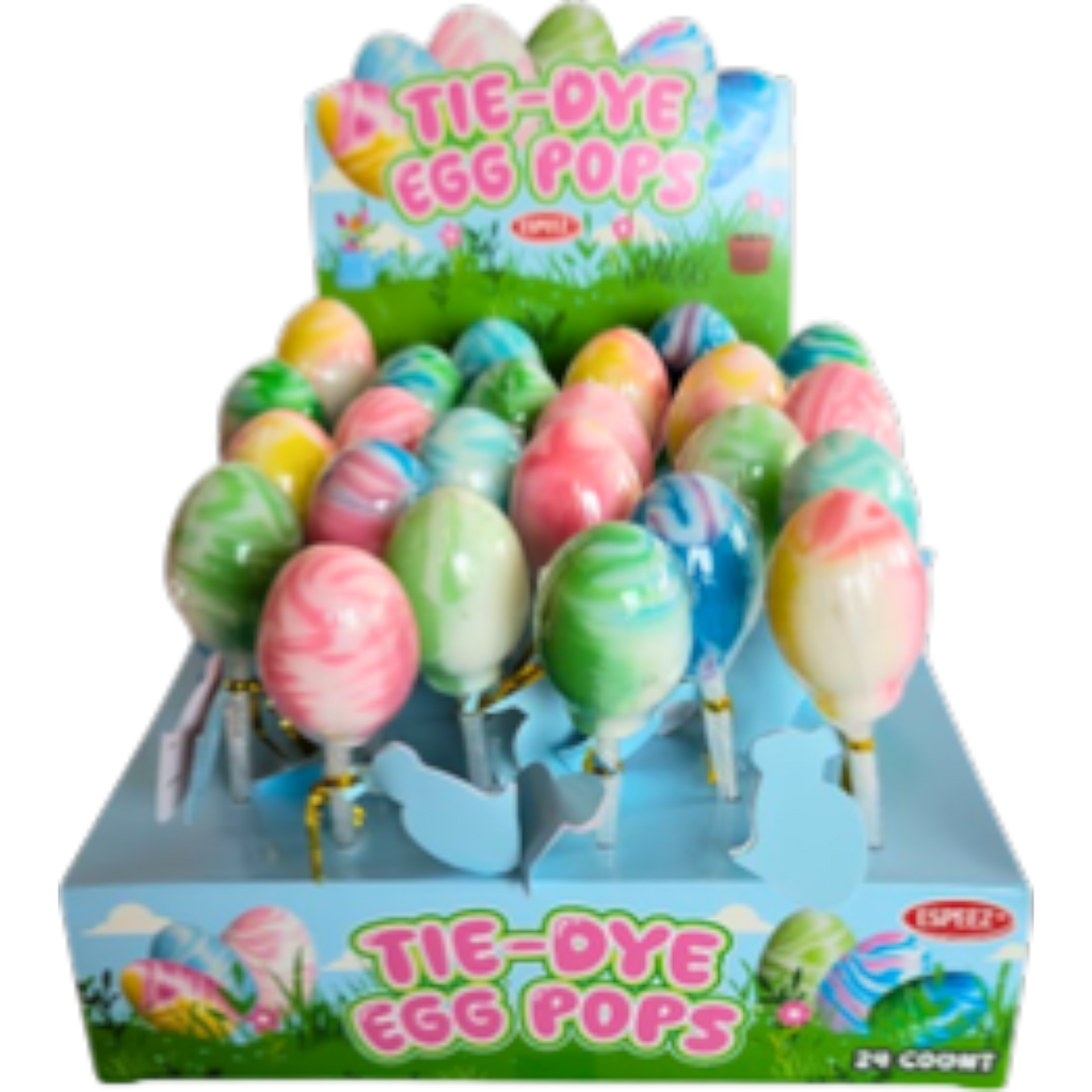 Tie-Dye Egg Pops. Egg shaped lollipops with a tie-dye flavor for design. Delicious and a great year round item. Especially great for Easter!